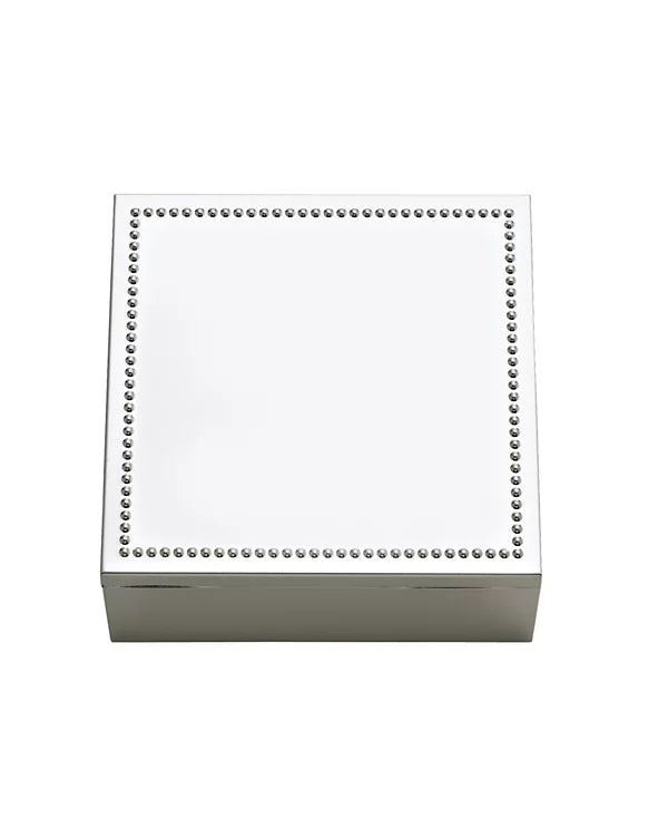 This square keepsake box features a tarnish resistant sliver plated box with a delicate beaded border. Perfect for storing jewelry and items worth holding onto. Add a monogram for a personalized touch!